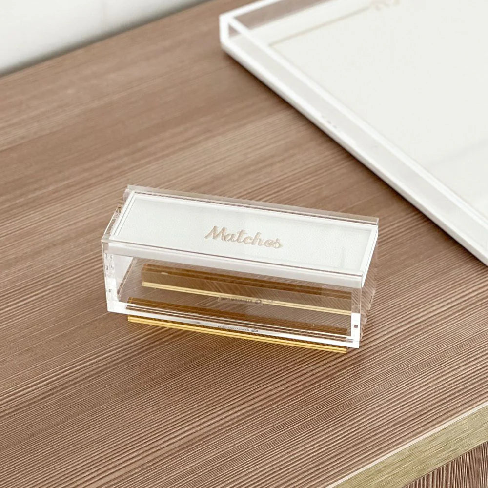 This luxurious clear lucite matches box with a sliding leatherette lid with embroidered text adds a subtly elegant touch to an already magnificent product.